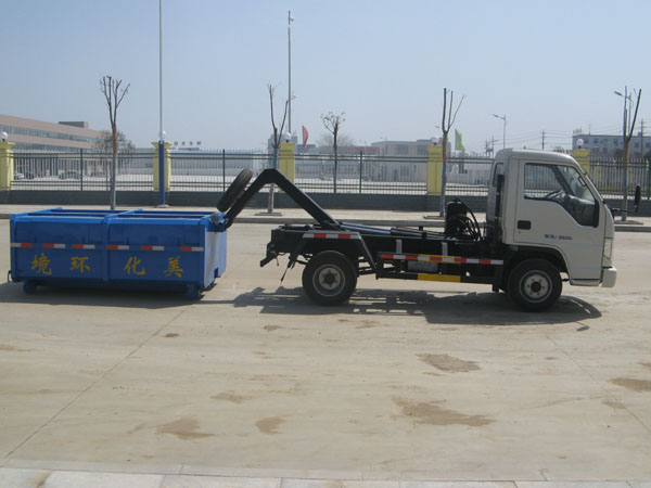 該車結(jié)構(gòu)簡(jiǎn)單,操作穩(wěn)定方便,裝卸效率高,機(jī)械化程度高,節(jié)省人力。一車可帶多個(gè)大廂,在裝卸的運(yùn)輸過(guò)程中可有效地避免二次污染。