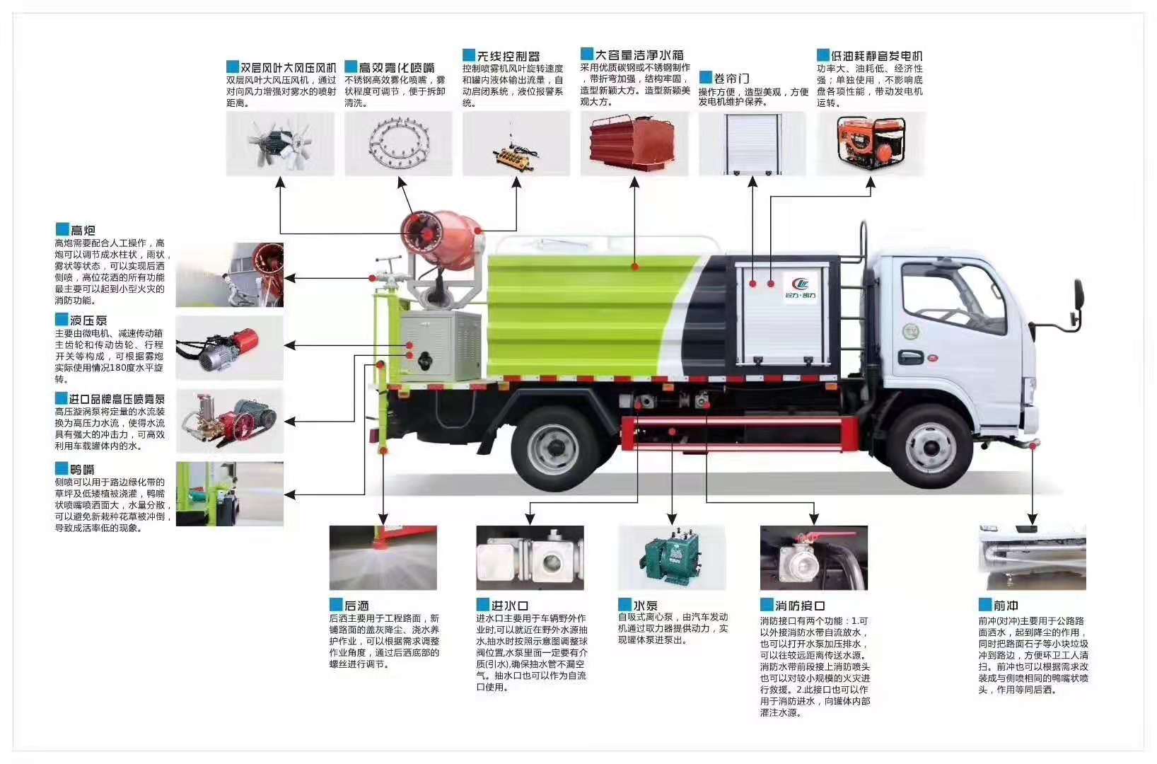 噴霧抑塵車隨車裝配大功率柴油機、三相交流同步發電機、三相異步電動機、三缸活塞泵,并安裝風機風炮,為農藥噴灑提供專一動力來源和專用設備。灑水泵可抽水排水,安裝濾網,帶消防接口,可通過消防栓進水,帶自流閥,隨車選裝20米噴藥綠化卷盤