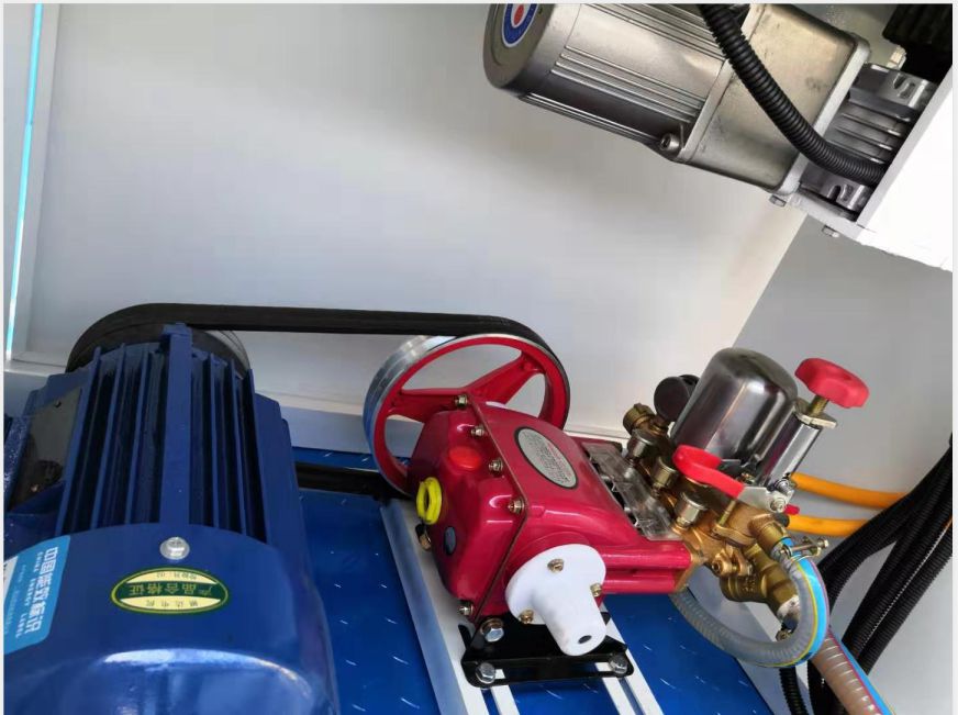 噴霧抑塵車隨車裝配大功率柴油機、三相交流同步發電機、三相異步電動機、三缸活塞泵,并安裝風機風炮,為農藥噴灑提供專一動力來源和專用設備。灑水泵可抽水排水,安裝濾網,帶消防接口,可通過消防栓進水,帶自流閥,隨車選裝20米噴藥綠化卷盤