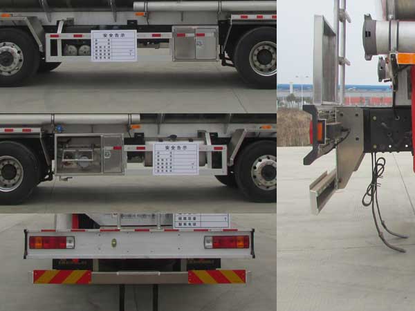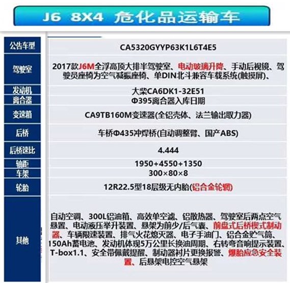 1、該車適用于危險品運輸,運送危險貨物車輛類型為:FL型,類項號:3;裝配限速裝置,限速79km/h;罐體有效容積31.6立方米,運輸介質(zhì):汽油,密度:700千克/立方米。罐體外形尺寸(長×寬×高)(mm):9200×2480×1810。軸距(mm)與后懸(mm)對應(yīng)關(guān)系:1950+4550+1350/2680,1900+4500+1350/2780。2、側(cè)/后防護材料均為鋁合金,螺栓連接;后防護截面尺寸120×60mm,下邊緣離地高480mm。3、ABS型號/生產(chǎn)廠家: 浙江萬安科技股份有限公司,型號:VIE ABS-Ⅱ;隨底盤選裝駕駛室,僅選用裝子午胎,限速裝置,前盤制動器,排氣管前置的底盤。該車應(yīng)裝具有衛(wèi)星定位功能的行駛記錄儀。發(fā)動機CA6DK1-32E51對應(yīng)的油耗值為: 38.5(L/100km) 該車后軸為采用空氣懸架.